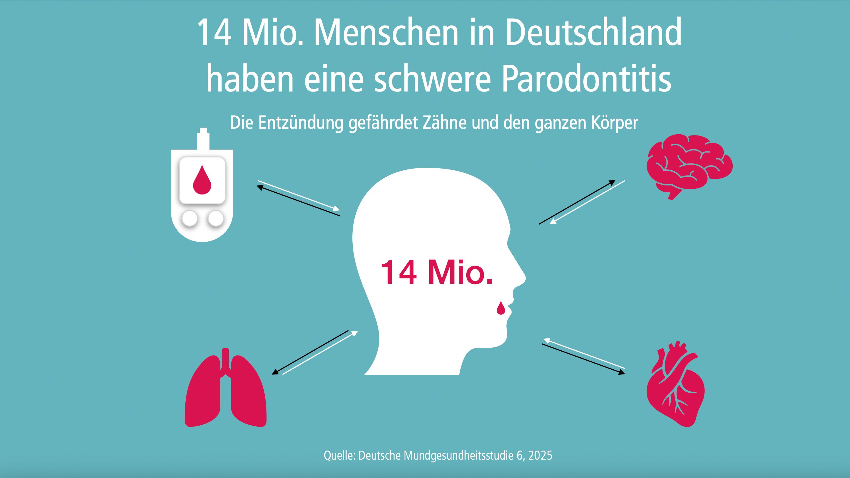 Die Zahlen alarmieren. Die Mehrheit der Erwachsenen in Deutschland leidet an Parodontitis, etwa 14 Millionen davon an einer behandlungsbedürftigen, schweren Form. Bakterielle Beläge auf Zähnen und am Zahnfleischrand lösen die Krankheit aus, die sich schleichend zur chronischen Entzündung mit weitreichenden Folgen entwickelt.