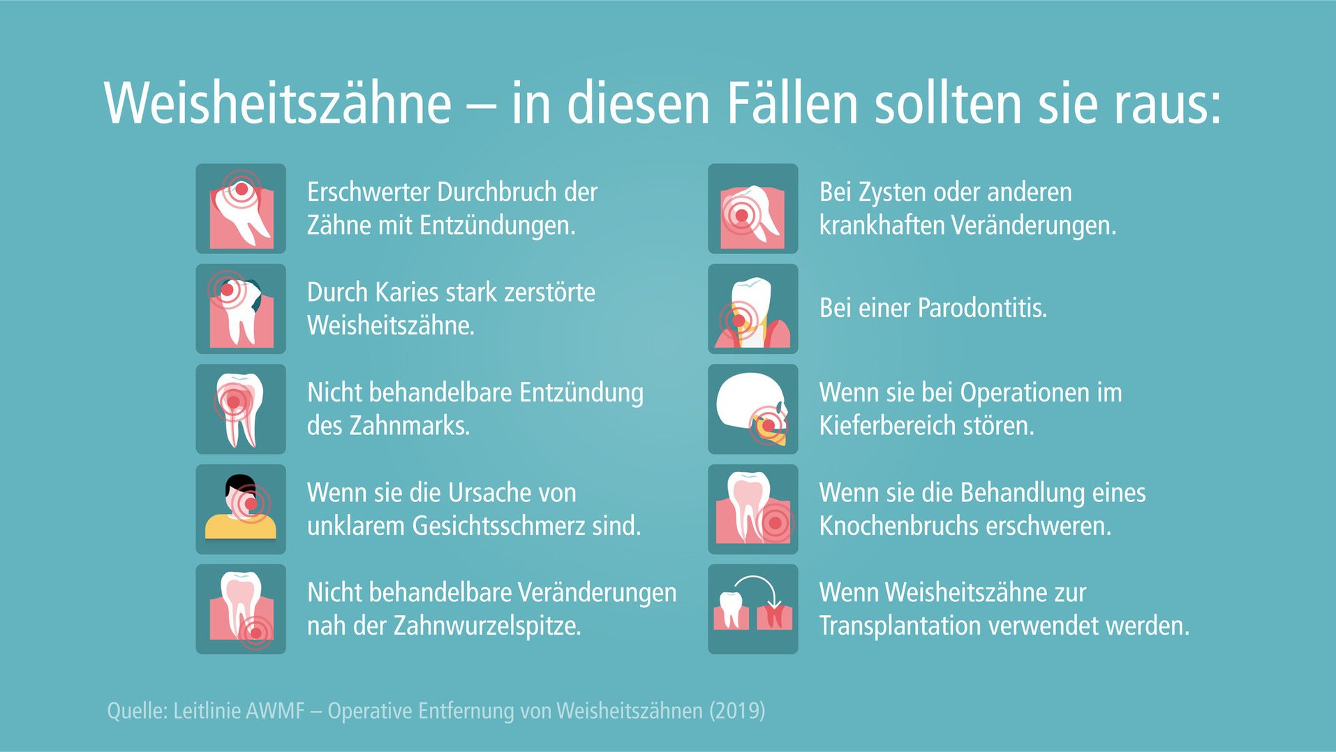 Wurde früher dazu geraten, auch beschwerdefreie Weisheitszähne vorsorglich zu ziehen, entfernen Zahnärzte die Weisheitszähne heute nur, wenn gesundheitliche Probleme auftreten oder abzusehen sind.
