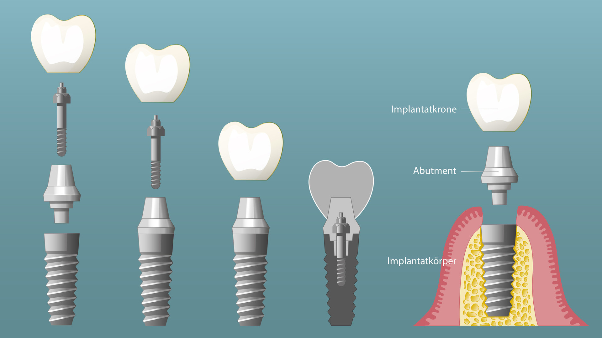 Nachdem das Implantat gut im Kieferknochen eingeheilt ist, beginnt die prothetische Versorgung mit Zahnersatz. Für den Abdruck oder den digitalen Scan ersetzt der Zahnarzt die Einheilkappe im Anschluss für kurze Zeit mit einem Abformpfosten oder einem Scanpfosten. Anhand des Abdrucks oder Scans wählt der Zahntechniker in Abstimmung mit dem Zahnarzt den passenden Implantatpfosten oder fertigt diesen individuell an. Den Zahnersatz wie Krone, Brücke oder herausnehmbaren Zahnersatz wie Prothesen fertigt der Zahntechniker ebenfalls individuell für den Patienten auf Grundlage der Konstruktionsplanung durch den Zahnarzt. Der Zahnarzt schraubt den Aufbau in das Implantat und befestigt den Zahnersatz darauf.
