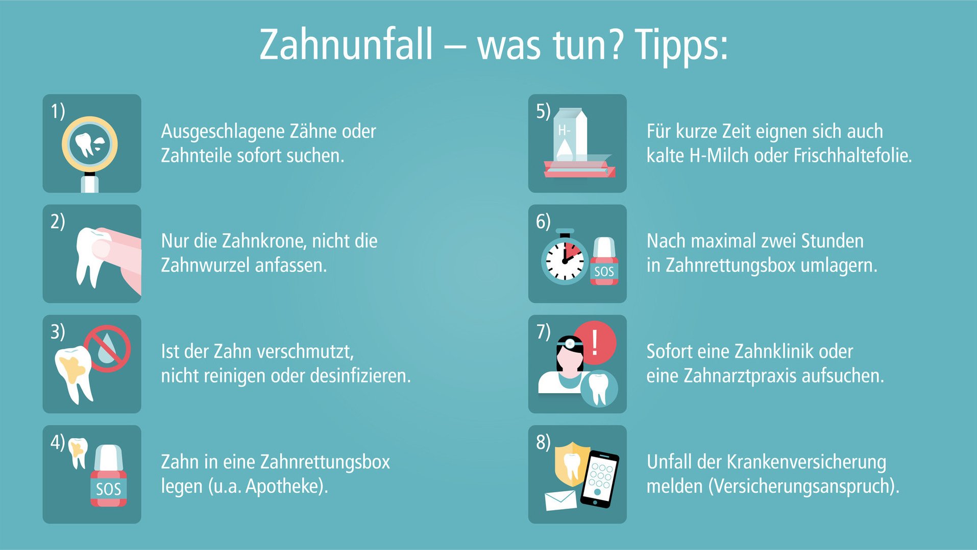 Häufig kann der Zahnarzt einen ausgeschlagenen bleibenden Zahn in den Kiefer zurückpflanzen oder ein abgebrochenes Stück wieder anbringen. Entscheidend ist, das Richtige zu tun: Den ausgeschlagenen Zahn sofort suchen und möglichst schnell in eine Zahnrettungsbox legen (zum Standortverzeichnis Zahnrettungsbox, auch in Apotheken für 15 bis 20 Euro erhältlich). Den Zahn dabei nicht an der Wurzel anfassen, reinigen oder trocken lagern. Die Zahnrettungsbox enthält ein spezielles Nährmedium. Darin können die empfindlichen Zellen der Zahnwurzelhaut bis zu 48 Stunden überleben. Dann sofort einen Zahnarzt aufsuchen. Ist keine Rettungsbox vorhanden, können auch kalte H-Milch, Frischhaltefolie oder eine Kochsalzlösung aus der Apotheke den Zelltod hinauszögern. Dies jedoch nur für eine halbe bis zu zwei Stunden. Ist nur ein Stück vom Zahn abgebrochen: suchen, in Wasser legen und mit zum Zahnarzt bringen.
